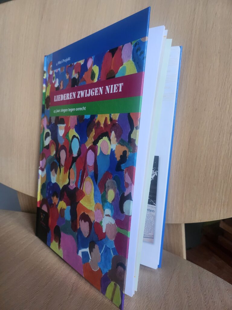 Wil je een exemplaar van dit boek in je bezit krijgen? Dat kan. Het jubileumboek ‘Liederen zwijgen niet’ kost € 20,–. Je kunt het bestellen door een mailtje te sturen naar ons koor én het bedrag over te maken op NL02 TRIO 0379 4233 59 van het 4 Mei-Projekt o.v.v. jubileumboek. Wij zorgen er dan voor dat het boek bij je bezorgd wordt. Voor bestemmingen buiten Groningen vragen we je ook om portokosten voor het versturen van een pakket over te maken.
