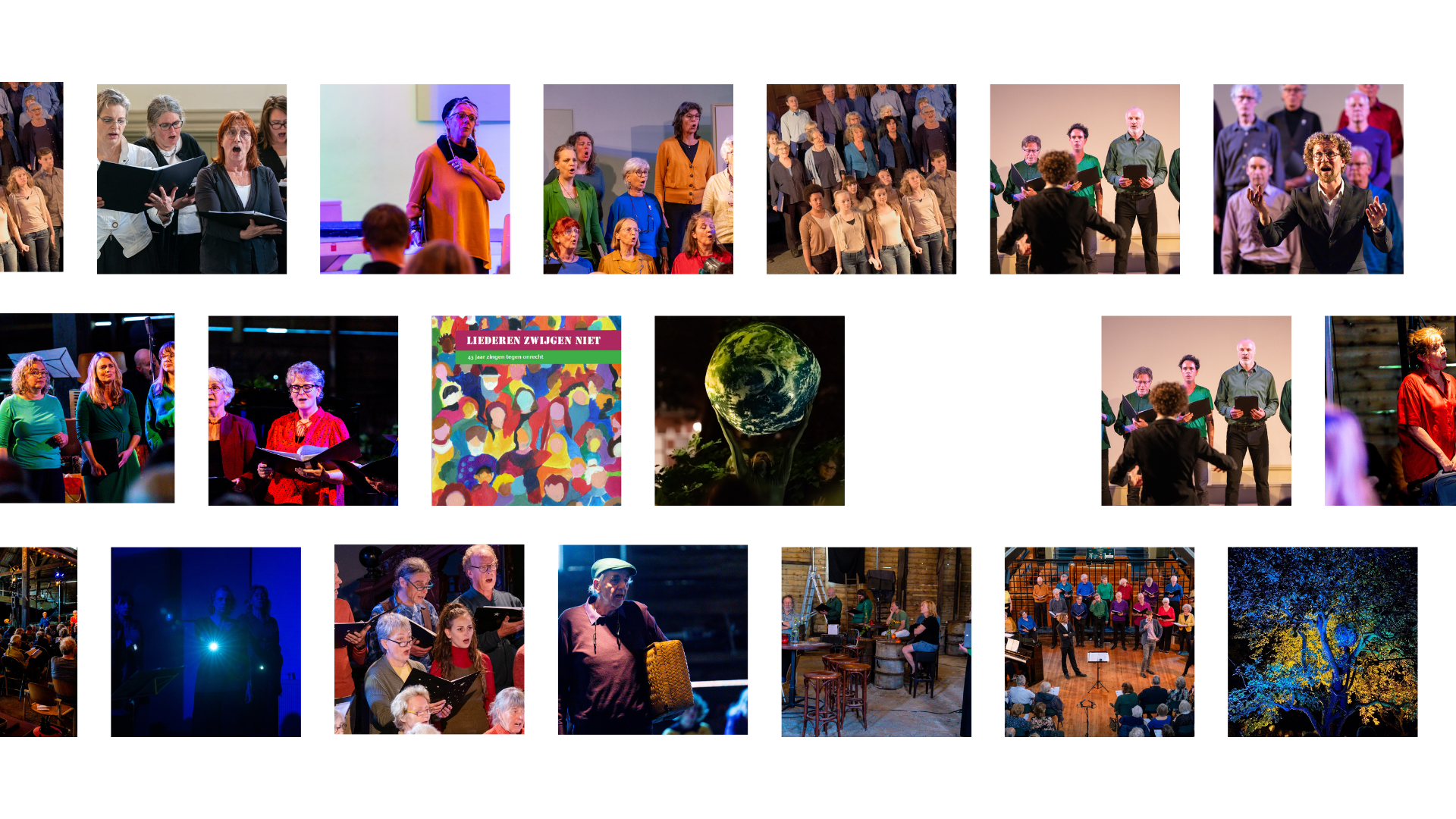 In het jubileumboek ‘Liederen zwijgen niet’ nemen we je mee op reis van toen naar nu. Een reis vol verhalen over aangrijpende optredens met muziek die ertoe doet, openhartige interviews, anekdotes over het rijke koorleven en foto’s van jonge koppies toen tot (veel) ouder in 2025.