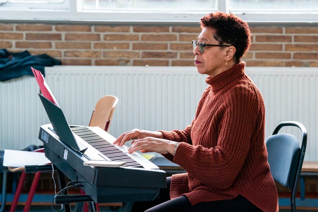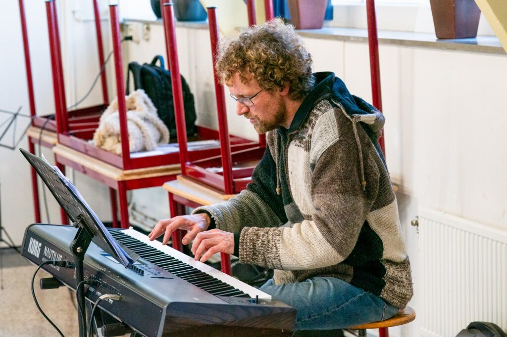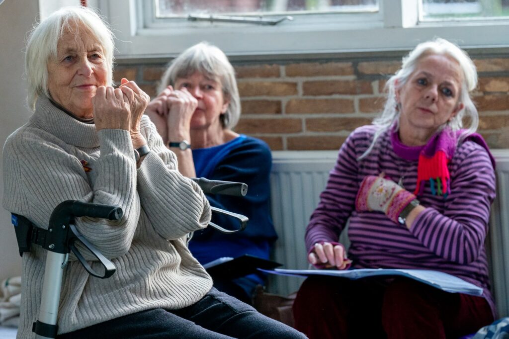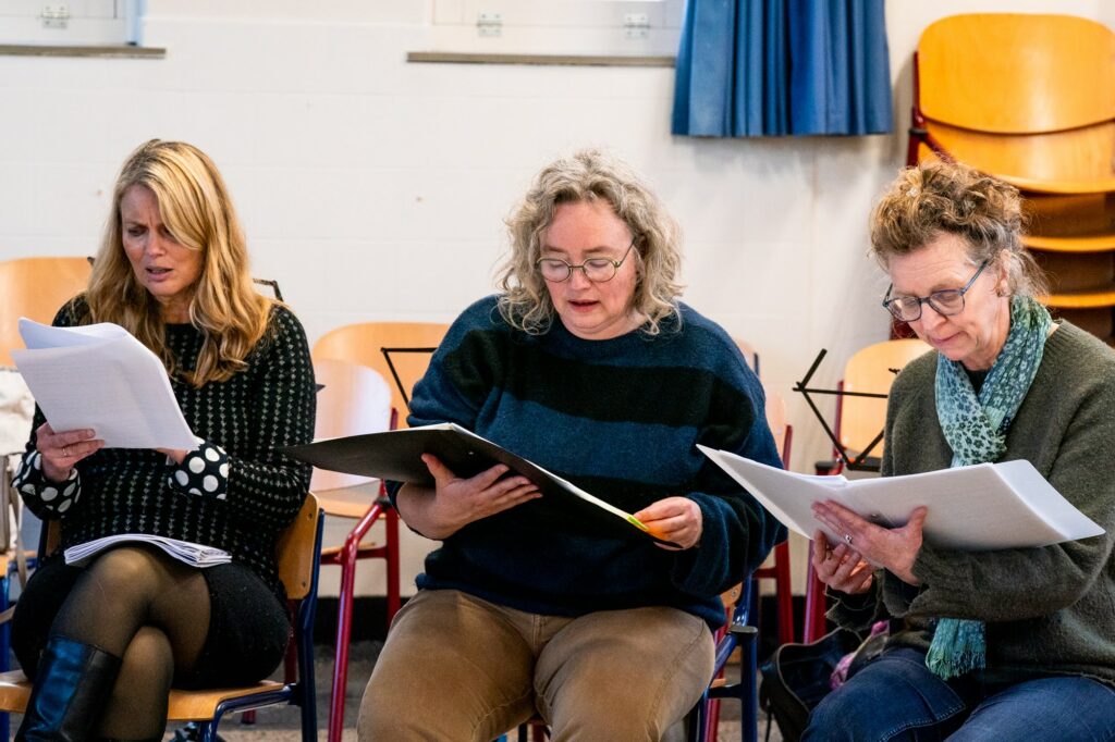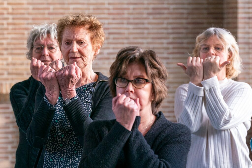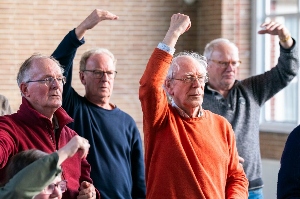 We zijn dit jaar later begonnen met oefenen voor het nieuwe programma omdat we eerst een jubileum wilden vieren. De muziekmap is nog nodig. Als je zo aan het zingen en aan het bewegen bent, kun je je map niet vasthouden, wat nog best lastig is. En toch? Het kon minder, zouden ze hier in de regio zeggen.