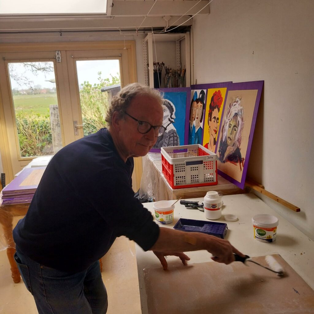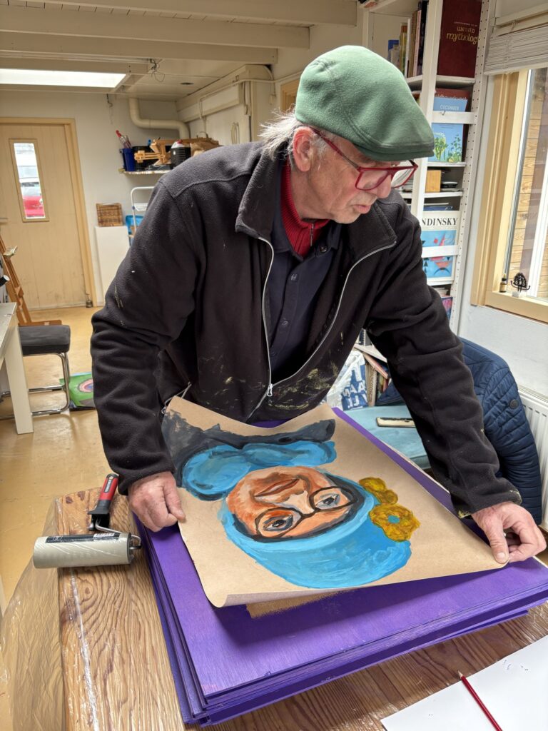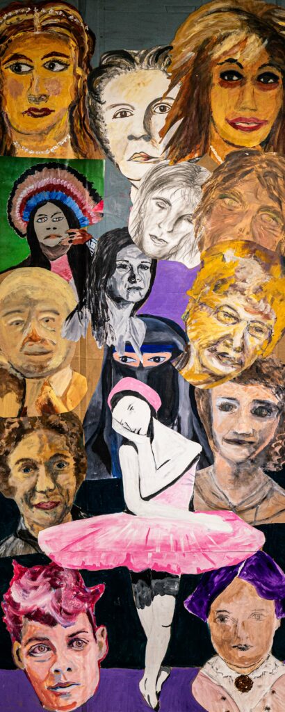 We schilderden onze Heldinnen met het koor maar ook met anderen die de kracht van vrouwen willen tonen. Positieve rolmodellen voor iedereen. Jolanda, Renate en andere koorleden knipten er een aantal uit en maakten er collages mee voor ons decor. Wim en Jelle plakten er een aantal op platen om die op een andere manier in het toneelbeeld te verwerken.