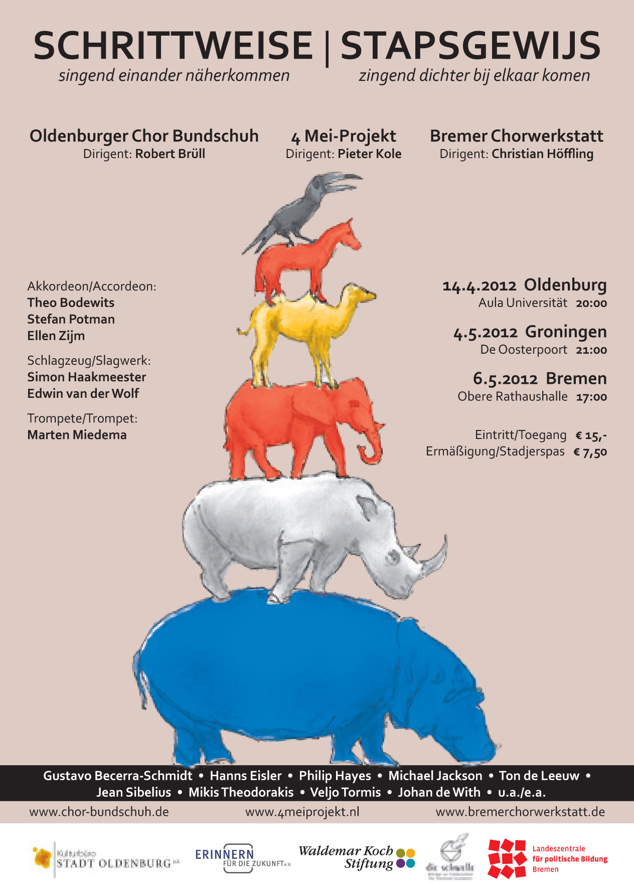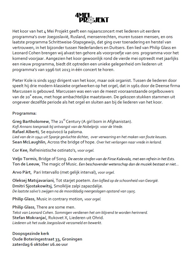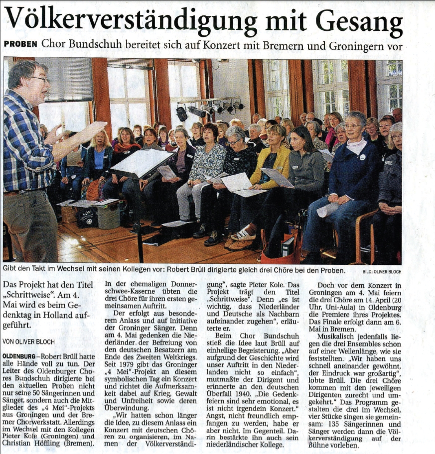 Toenadering zoeken en samen op weg naar een betere toekomst: dat is het streven van het 4 Mei-Projekt uit Groningen, de Bremer Chorwerkstatt en het Oldenburger Chor Bundschuh in een grensoverschrijdend project. Aanleiding is de nationale dodenherdenking van de Tweede Wereldoorlog op 4 mei. Sinds 1979 geeft het 4 Mei-Projekt op en rond deze dag concerten en richt daarbij de aandacht ook op actuele oorlogssituaties, onderdrukking en onvrijheid – en op perspectieven om deze te laten ophouden. Voor de eerste keer heeft het 4 Mei-Projekt nu twee Duitse koren uitgenodigd om een gezamenlijk programma uit te voeren. Daarbij gaat het om wederzijdse toenadering en tolerantie en om de rol die muziek daarbij kan spelen. Deels zelfstandig, deels gezamenlijk zingen de koren voornamelijk liederen uit de 20e eeuw, onder andere van Jean Sibelius, Hanns Eisler, Mikis Theodorakis, Ton de Leeuw, Veljo Tormis, Johan de With en Michael Jackson.