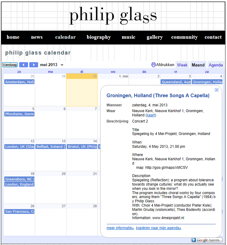 Philip Glass (1937) is een van de bekendste nog levende Amerikaanse componisten. Hij studeerde wiskunde en filosofie aan de universiteit van Chicago en dwarsfluit aan de Peabody Conservatory of Music te Baltimore. Omdat hij zich niet kon vinden in wat destijds doorging voor moderne muziek, verhuisde hij naar Europa. Hij werkte jarenlang samen met sitar virtuoos en componist Ravi Shankar. In 1967 ging hij terug naar New York en formeerde hij zijn Philip Glass Ensemble. De nieuwe muzikale stijl die hij ontwikkelde, kreeg de naam ‘minimalisme’. Glass zelf hield echter niet van deze term en spreekt liever over zichzelf als een componist die muziek maakt met ‘repetitieve structuren’. In de 25 jaren dat hij werkzaam is als componist heeft hij meer dan twintig kleinere en grote opera’s gecreëerd, acht symfonieën, twee pianoconcerten en concerten voor piano, viool, timpaan en saxofoonkwartet en orkest.