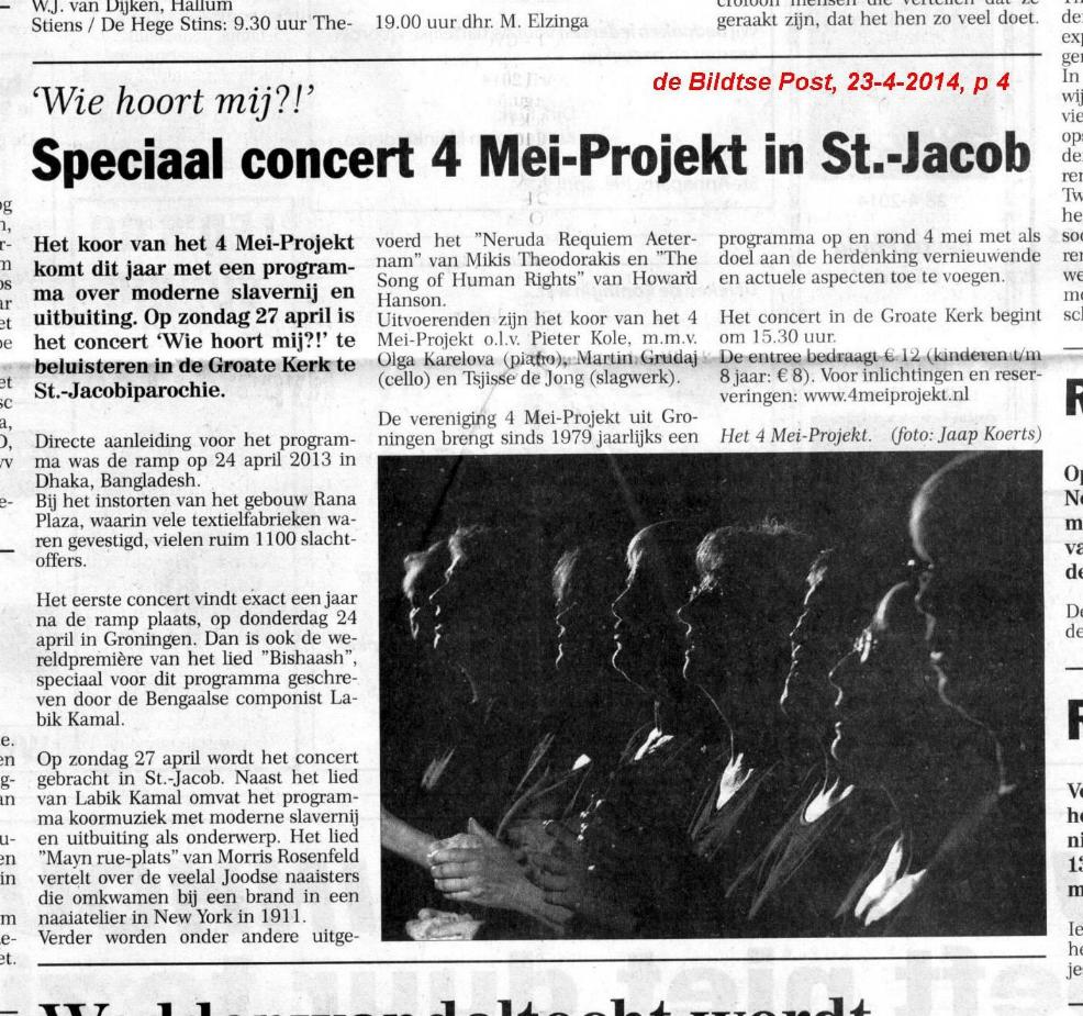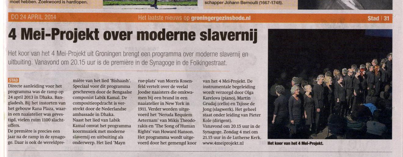 Programma Het 4 Mei- Projekt brengt in mei 2014 een programma over hedendaagse slavernij en uitbuiting. In het jaar van 150 jaar herdenking van de afschaffing van slavernij, 2013, werden we opgeschrikt door het drama in de kledingfabriek Rana Plaza in Dhaka, Bangladesh. Bij het ineenstorten van het fabrieksgebouw vielen vele slachtoffers. Eenzelfde soort gebeurtenis vond een eeuw geleden plaats in New York, door een brand in een naaiatelier vielen honderden doden.