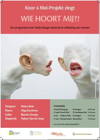 Wat is er veranderd in een eeuw, behalve dat zo’n drama zich verplaatst heeft van de ene kant naar de andere kant van de wereld? Slavernij en uitbuiting is nog steeds niet uitgebannen. Dat blijkt uit recente schattingen van de Internationale Arbeidsorganisatie (IAO). Op dit moment zijn zo’n 20,9 miljoen mensen gedwongen aan het werk waarvan 880.000 in de EU (Bron: “Der Spiegel”en “De Volkskrant”, 12 oktober 2013). In 2014 is het 35 jaar geleden dat het koor van het 4 Mei- Projekt haar eerste programma ten gehore bracht over sociaal onrecht. Nog steeds zijn we hier niet over uitgezongen. Door te zingen over misstanden en onrecht vraagt de vereniging, waar het koor een belangrijk onderdeel van is, elk jaar aandacht voor een nieuw onderwerp. Zo worden er al 35 jaar lang onafgebroken elk jaar op en rond 4 mei een aantal concerten gegeven. Het koor, met begeleiding van piano, cello en slagwerk, zal de volgende stukken ten gehore brengen.